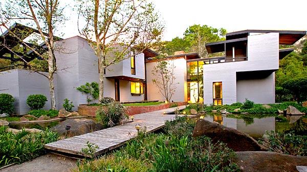 A bridge over a koi pond leads to a 9-foot-high leaded-glass front door. Cattails growing in the pond inspired the design of the door, which is framed in redwood.